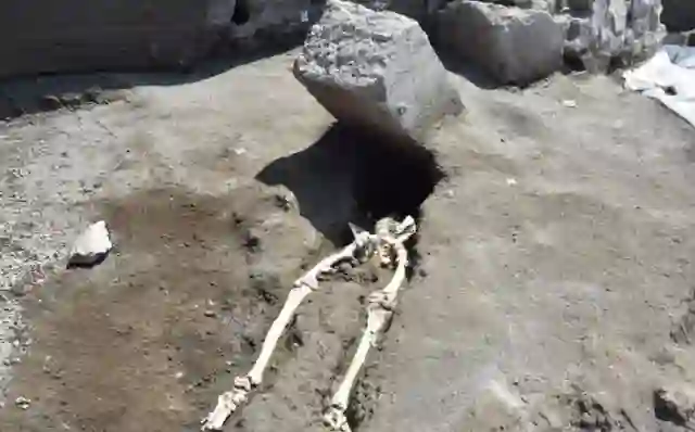 尤其残酷的是,他的腿不好啊。考古学家发现,这具遗体的小腿骨有严重感染的痕迹,可能无法正常行走。可以想象,在躲过开始喷发后,他也许绝望地在巷内跛行,无法像正常人一样快跑和闪躲。最终,迎面飞来一块巨石将他砸进建筑物一层,不幸罹难。