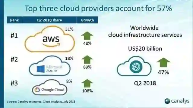 根据Canalys调研数据显示,2018年全球云计算市场规模突破800亿美元,达到804亿美元,同比大幅增长46.5%。前十大云服务提供商分别为AWS、微软Azure、谷歌云、阿里云、IBM云、Salesforce、Oracle、NTT通信、腾讯云和OVH。其中,前三名AWS、微软Azure、谷歌云总市场份额已经超过50%。并且这一现象,一直维持了很多年。