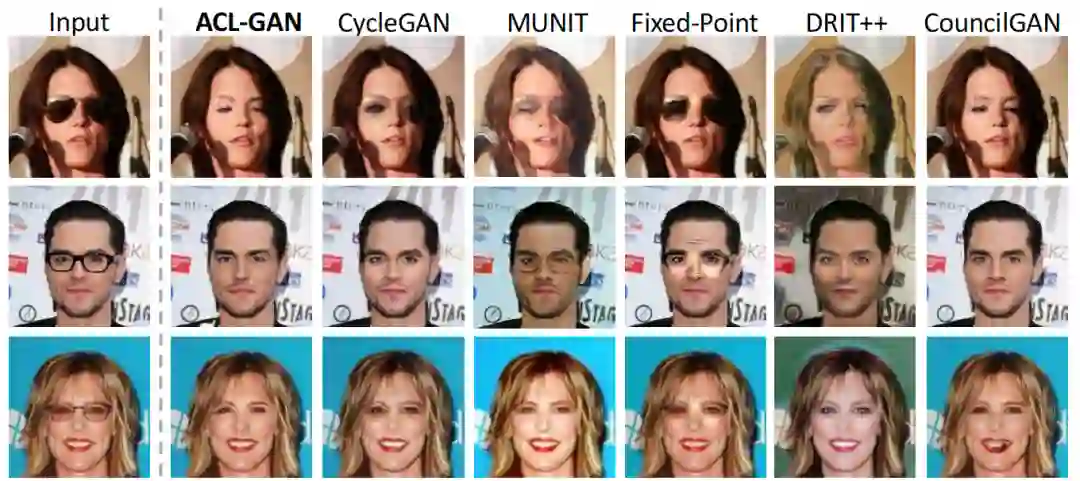 眼镜去除任务主要有两大难点:1)眼镜外的区域要求完全保留不变;2)眼镜隐藏的部分信息要合理的补充出来,如太阳镜完全遮住眼睛。可以看到,ACL-GAN 不仅成功完成上述任务,而且没有留下任何“作弊”的痕迹。