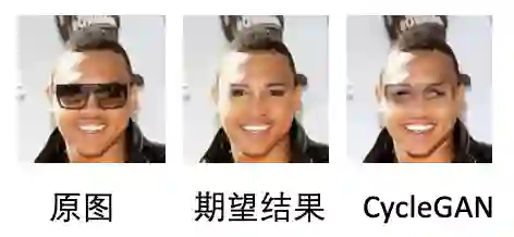 ),而这对于很多任务是不现实的。比如单纯看到图1的期望结果,让我们去画一个眼镜,显然有无数种情况,对于生成器也是如此。再比如性别转换时胡须、头发的变化等等,这类问题都具有不可逆的特性。当 cycle loss 尝试解决这类问题时,就必须“作弊”在图片中留下痕迹或减小变化,也就导致了结果的不真实(图1 CycleGAN)。
