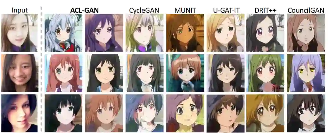 自拍到动漫转换任务改变幅度最大,整张图片风格和主题都需要发生较大改变。ACL-GAN 生成的结果自然,而且符合动漫人物的特征(如大眼睛、小嘴巴等) ,而且也与原图有更大的相关性。
