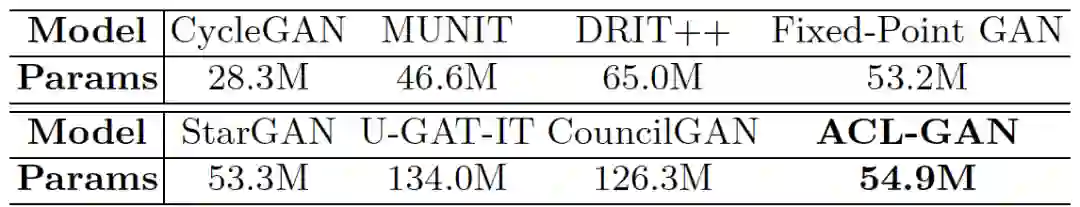 除此以外,该方法的网络参数较小,与大部分已有方法相当。ACL-GAN 的参数数量甚至不到表现相近方法(CouncilGAN、U-GAT-IT)的一半。具有较小的训练和存储开销。