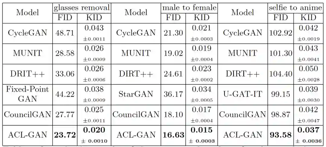 为了进一步证明该方法的有效性,作者采用 FID、KID 指标量化评价三个任务上不同方法的表现,ACL-GAN都取得了最优的成绩,大部分结果都远远优于采用 cycle loss 的方法。
