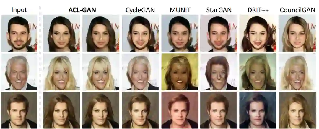 性别转换任务具有公认的三大难点:1)多模态变化,对于同一张输入,可以有多种输出对应;2)性别转换不仅要求改变颜色和纹理,还需要改变形状(如头发);3)配对的数据无法获得。即使面对这些难点,ACL-GAN 仍然很好的完成了该任务,无论是头发、胡须的变化,还是五官特征、背景的保留,都优于现有方法。