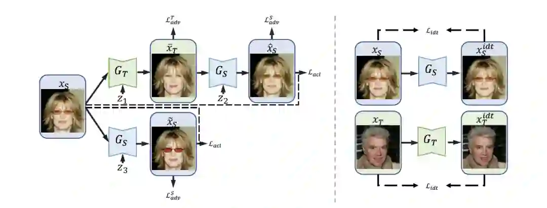 ACL-GAN 为了规避生成器“作弊”留下眼镜痕迹,并不限制点到点的相同,而是将各种眼镜统统纳入怀中。为了允许不同细节的图片都被认为和原图相同,该方法将原图