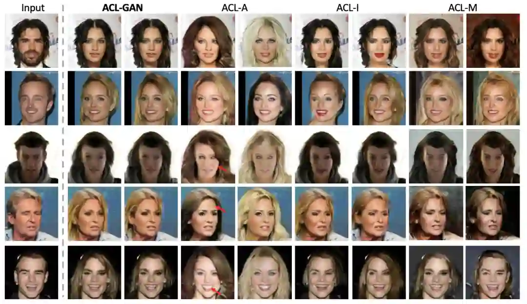 虽然每一种模型都成功实现了性别转换,而且结果已经可以以假乱真,但仔细比较,我们仍然可以发现不同约束的作用,增强了该方法的可解释性。该实验结果符合分析:ACL-A 的结果虽然成功转换,但生成图片和原图之间关联性不强,如发色、肤色、周围、牙齿等发生明显变化;ACL-I 的结果视觉上差距不大,但量化指标略低于 ACL-GAN;ACL-M 的背景明显发生变化,图片质量也略低于 ACL-GAN,原因是 mask 可以帮助生成器将注意力集中在前景上。