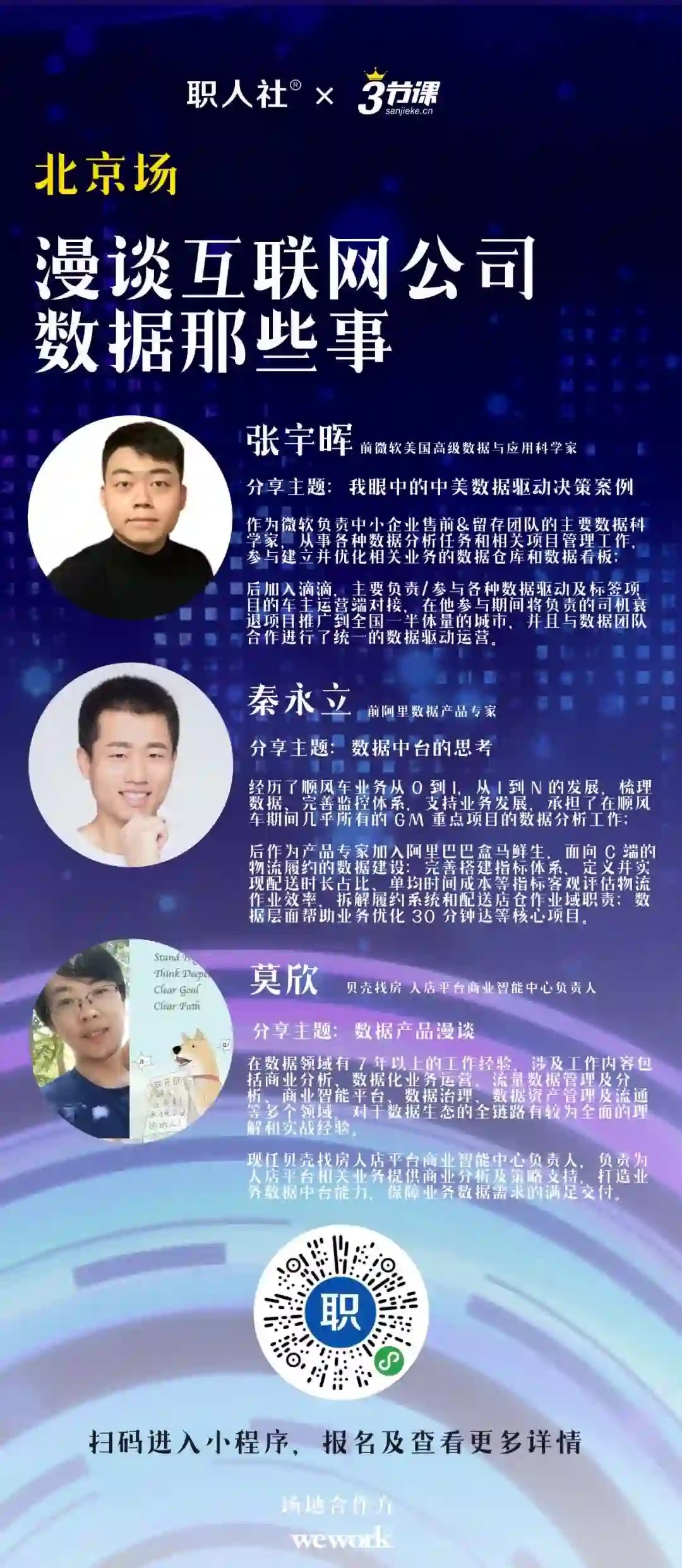 带着上面那些问题,我们分别邀请到前阿里巴巴盒马鲜生产品专家、前微软(美国)高级数据与应用科学家及贝壳找房产品总监和我们聊聊他们分别对于数据分析、数据中台和数据产品的思考。如果你也正在研究这个方向,那这场沙龙可能会对你有所帮助,欢迎报名参加。