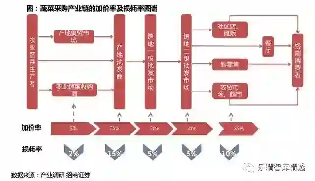 产品种类SKU较多;供应链企业从产地直采,但绝大部分是批发商采购,而实现产地直采的超市企业较少(永辉和家家悦在蔬菜直采做的比较领先)。而传统的蔬菜采购模式加价率较高,流通渠道的损耗率达到37%,损耗率较高。