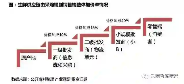 传统的生鲜采购模式从原产地到终端消费者产业链一般经过四个加价阶段,整体加价率在45%,一级批发商承担的是报价、上游整合以及采购功能,上游农产品种植分散;加价率约在10%左右;