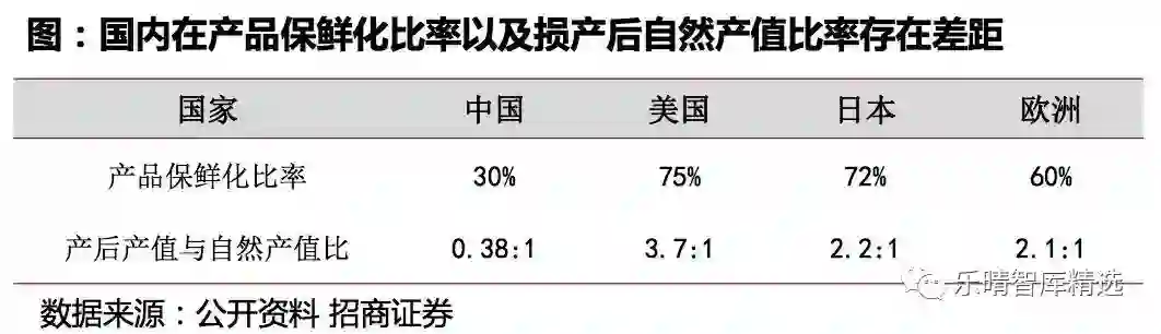 国内生鲜整体损耗率水平较高,中国农产品冷藏加工与其他国家相比,产品保鲜化运输比率较低,而欧美日等成熟国家的产品保鲜化比率水平较高,整体维持在60%以上;而根据产后产值与自然产值的比率,中国:美国:日本:欧洲=0.38:37:2.2:2.1;整体水平提升空间大。