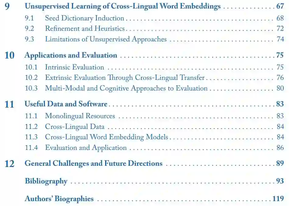 第九章介绍了,不依赖于显式双语监督信号、以无监督方式学习跨语言词嵌入的近期研究;