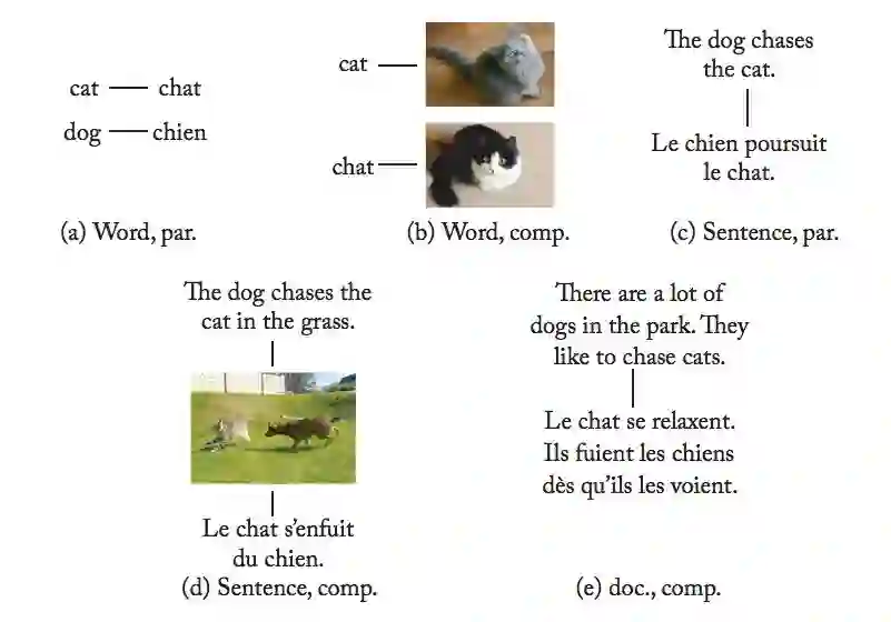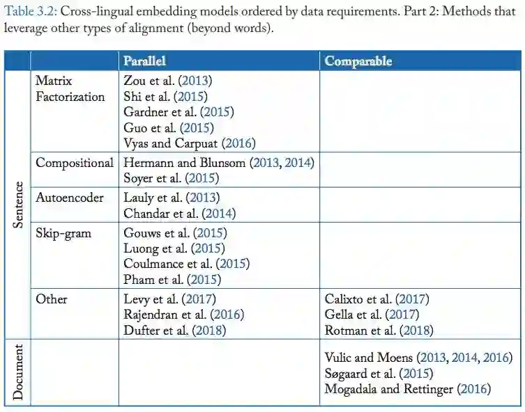 对齐类型:跨语言词嵌入模型使用不同类型的双语监督信号:词级、句子级、文档级。一些监督信号更细粒度,例如,词级对齐更容易展示两个单词在对应语境中是否语义对应或类似;但有时候研究者需要依赖较为粗粒度的信号,比如将句子或文档进行对齐。