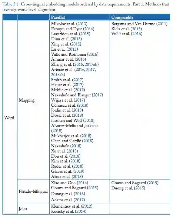 这本书按照该分类方法进行不同方法的介绍、分析和对比,细致地介绍了跨语言词嵌入问题。