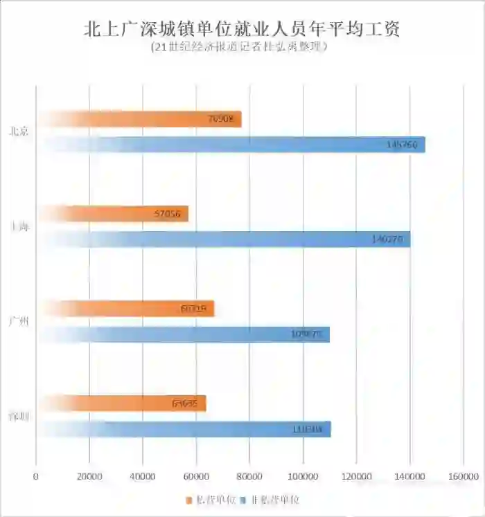 城镇非私营单位口径中,平均工资数据如下:北京145766元、上海140270元、深圳110304元、广州109879元。城镇私营单位口径中,平均工资数据如下:北京76908元、广州66719元、深圳63635元、上海57056元。