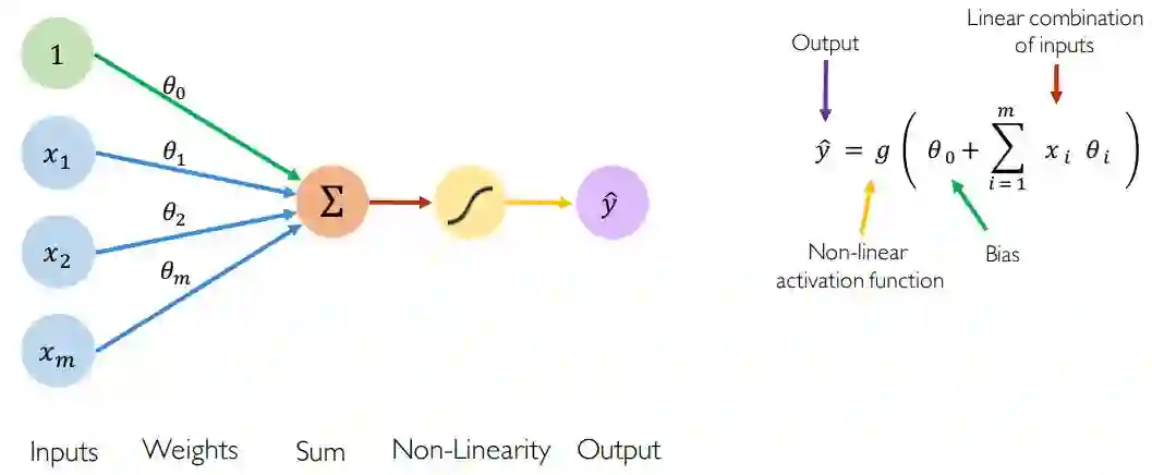 给定一组有限的m个输入(例如,m个单词或m个像素),我们将每个输入乘以一个权重,然后对输入的加权组合进行求和,并添加一个偏差,最后将它们输入非线性激活函数,输出