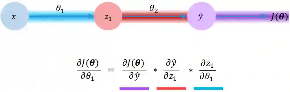 为了计算给定向量的损失函数的梯度,我们使用反向传播。考虑上面的简单神经网路络,它包含一个隐含层和一个输出层。想要计算与每个参数有关的损失函数的梯度,首先,应用链规则,因为