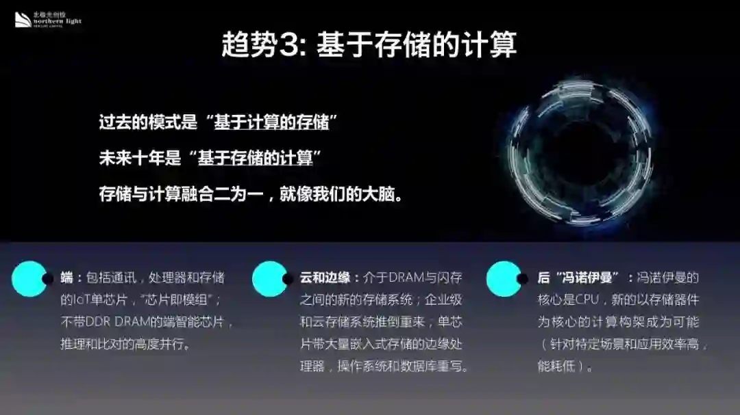 第三个趋势是基于存储的计算,这可能是最尖深的一个事。这个事也是我们关注了很长的时间,大家都知道冯诺伊曼计算架构,核心是计算,存储是一个边缘的设备。