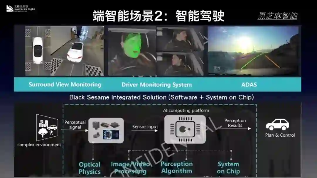 上面是今天软件这些结果,包括现在在车厂里面都需要的一些产品,360环视,驾驶员的监控系统和ADAS,我们看到辅助驾驶ADAS的demo的时候,都是一些比较简单的场景,黑芝麻专门挑这种大雨、大雪的夜晚,逆光这些特殊的场景去展示他们技术的能力。为什么他可以做到这个?