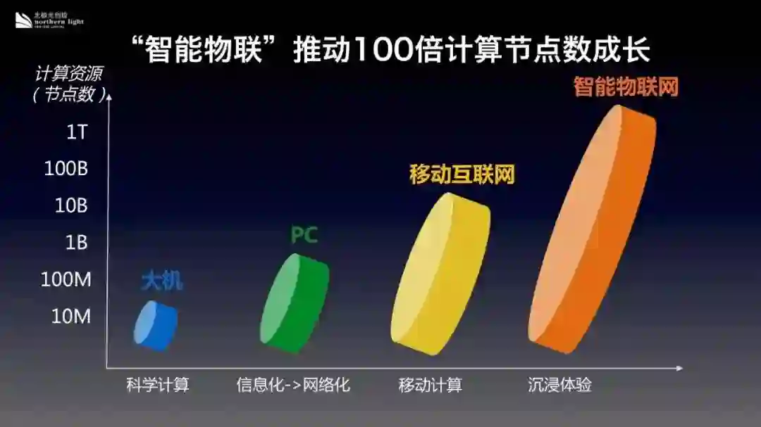 如果我们从大机时代,可能不到一千万的机器,到了移动互联网,超过10亿台设备,现在应该是超过100亿了。我们认为从移动互联网到智能物联网,还有一百倍的空间,这是一个巨大的市场潜力,这也会带来很多不同的机遇。