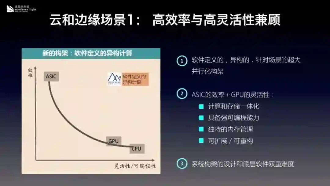 在这种场景下,登临做的就是如何去平衡灵活性和效率,做到软件定义的异构计算,在一个异构平台的计算上面有一个软件,上层的软件改变的时候,不会影响到下面底层的硬件。只有做到这种隔离,才有可能做到效率和可编程性的两者的统一,其实非常难,不像一般做一颗芯片,我有一个算法,把它AC化就可以了,其实在整个系统构架的设计和软件上面都需要非常深的功底,一般的团队是不敢碰。