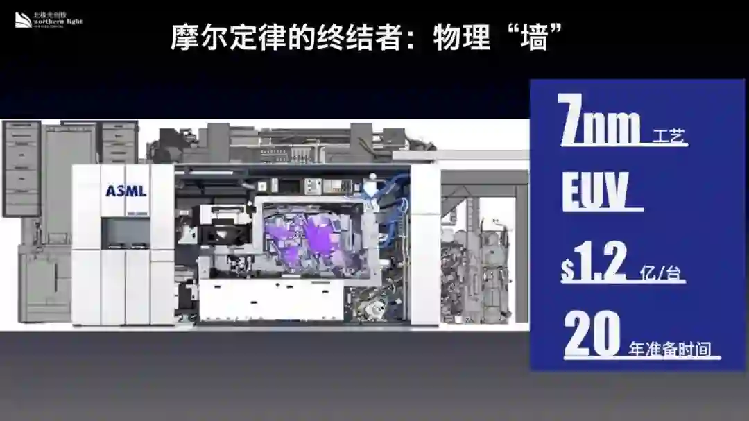 第一垛墙是前面的物理墙,从我读研究生开始到现在20多年了,终于EUV量产了,每台设备是1.2亿美金,甚至在研发设备的时候,和全球唯一的厂商,必须让几个大的客户出钱,一起来研发,因为经济性已经没有办法证明了。我们后面看的是一个庞大的设备,大概三个人高,长度也非常长,中间这一块其实有很多的学问,如果做光学的人知道这是反射体系,不是投射体系,已经没有任何透镜在EUV这个波长上面可以用了。更可怕的是整个EUV下面是什么,没人知道。即使你知道上一个难题,已经花了20年,如果你不知道呢?