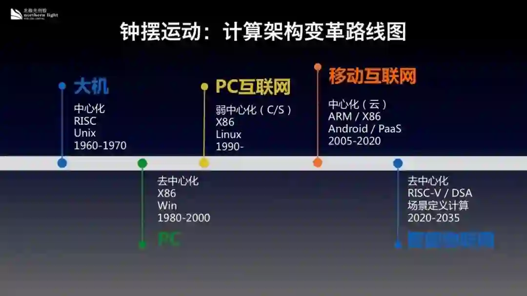 这个是赵顾的PPT,总结得非常好,整个计算架构其实像钟摆一样在不断的摆动,这里面有两个特点,第一个特点就是从IBM的大机时代,到了PC的去中心化时代,到了PC互联网的弱去中心,到了移动互联网的强中心,它在摆动。