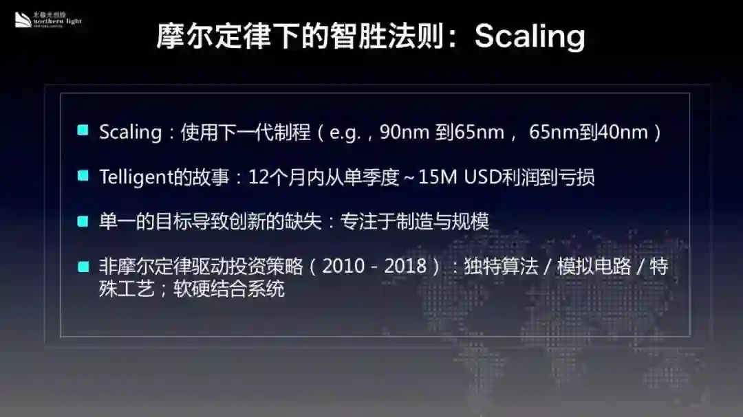 摩尔定律有它的优势,简单,但其实也很粗暴,因为在这个粗暴之下,创新变得不那么重要了,在这种时候更大的价值是规模和制造。北极光也有惨痛的教训,这里面给大家列的是我投资的公司,曾经在摩尔定律的作用下,因为稍微晚了一拍,净利润从一个季度的1500万美金到一年之后变成了0,最后不得不卖给另外一个厂家,本来可以成为独角兽的。