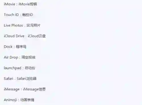 比如iMovie改成iMovie剪辑,Touch ID是触控ID,Animoji是动画表情。有网友整理了一个较为完整的列表,苹果对程序名称汉化多达10个左右,还是比较用心的。