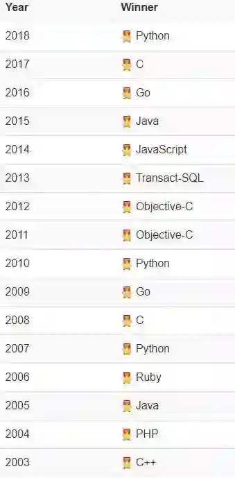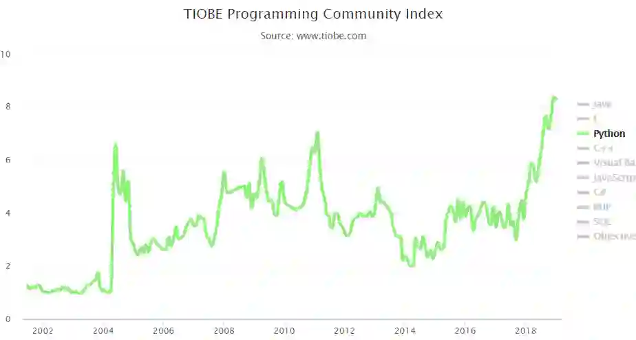TIOBE 近日宣布:Python 成为 2018 年度编程语言,Python之所以获得这个称号,是因为它在2018年的排名中比其他所有语言都高。Python语言赢得了3.62%的选票,紧随其后的是Visual Basic . net(3.2%)和Java(2.69%)。Python如今已经已经成为大型编程语言的一部分。近20年来,C、C++和Java一直排在前三名,遥遥领先于其他语言,但Python如今已经加入到了他们的行列之中。