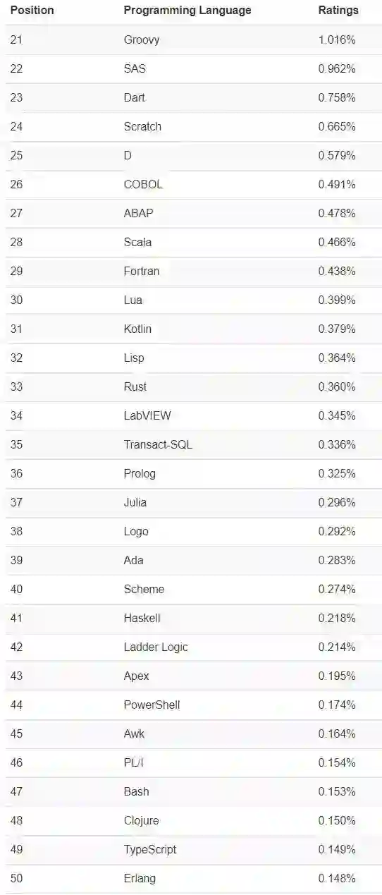 2018年其他大有进步的编程语言有MATLAB(第18到第11位)、Kotlin(第39到第31位)、Rust(第46到第33位)、Julia(第47到第37位)和TypeScript(第167到第49位)。