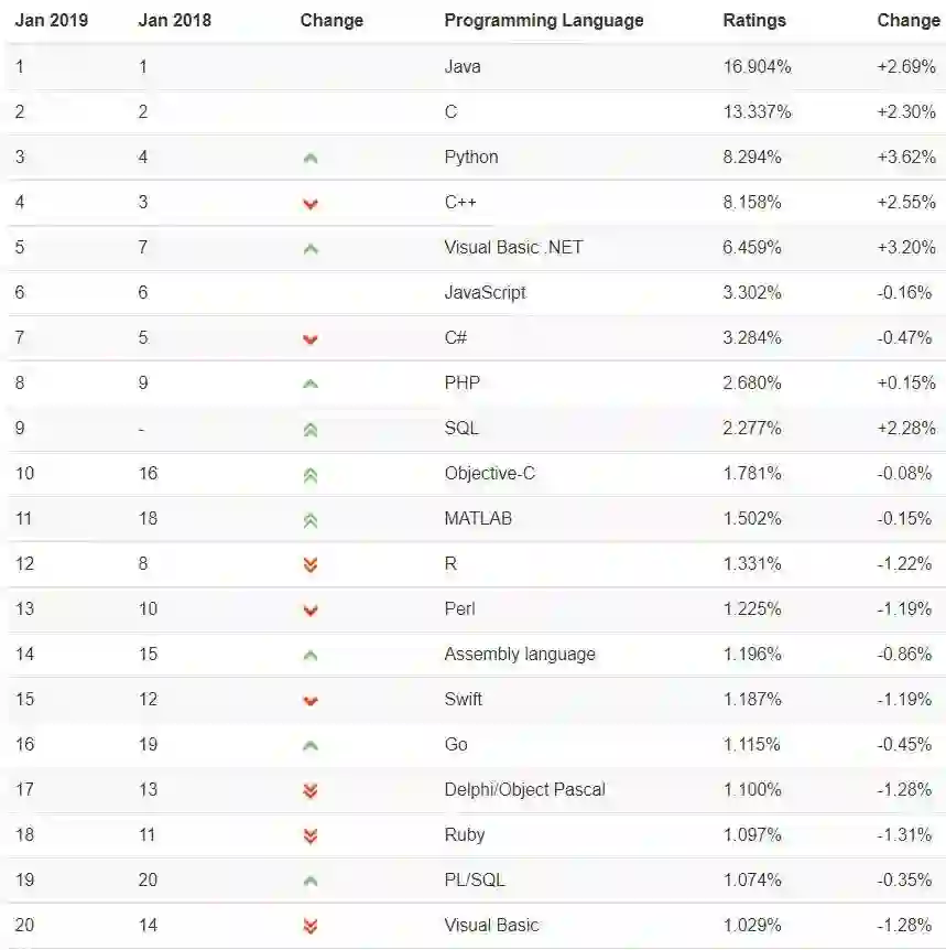 注意:SQL 自 2018 年 2 月起被重新添加到了 TIOBE 排行榜中,由于没有以往的数据可以对比,增长速度非常快,现在位居第 9 名。