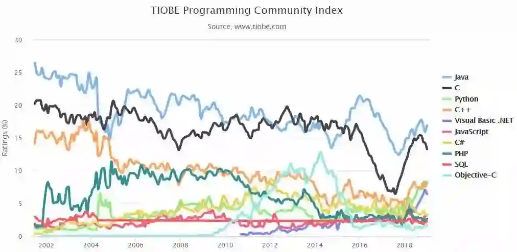 Top 10 编程语言 TIOBE 指数走势(2002-2018)
