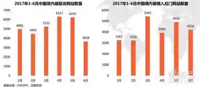 数据显示,2017年上半年,中国境内被篡改的网站数量在3500至6500个之间,被植入后门网站数量在3000至5500个之间,被篡改和被植入后门网站主要为商业类网站。