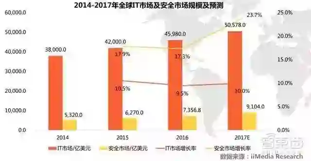 艾媒咨询数据显示,2016年全球IT市场45980.0亿美元,其中,安全市场增长至7356.8亿美元,占16.0%。随着企业对信息安全的重视加强,预计将在2017年达到9104.0亿美元。而根据ABIResearch,中国网络安全市场当前的规模为49亿美元,预计到2017年将翻一番至98亿美元。
