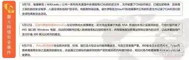 为此,美国战略与国际问题研究中心(CSIS)的网络政策专责小组发布了《从认知到行动——第45任美国总统安全议程》,为特朗普政府提供未来5年网络安全战略建议。国内方面,自6月1日《网络安全法》正式实施以来国家网信办、工信部、公安部、新闻出版广电总局、最高人民法院、最高人民检察院陆续推出了34项相关配套新政。