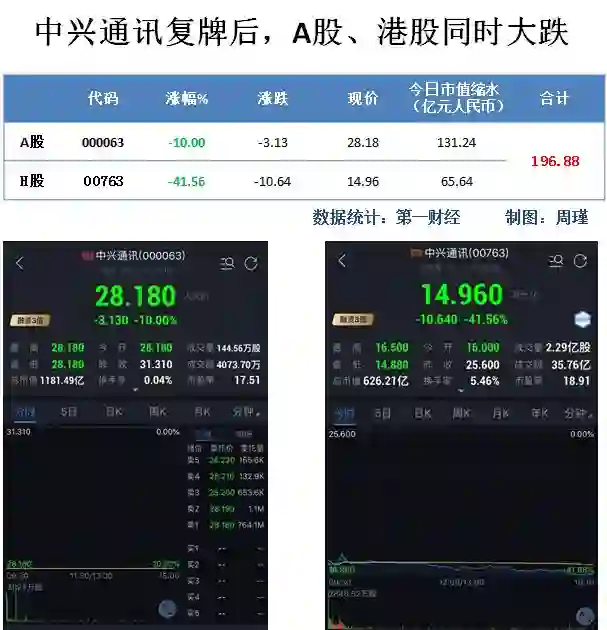 也就是说截至收盘,中兴通讯A股+港股市值合计蒸发196.88亿元。