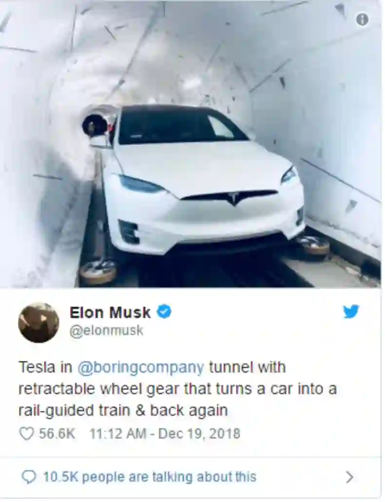 12 月 18 日,Boring 公司在加州霍桑市举行的一场活动上,向公众展示了其耗资 1000 万美元、长 1.14 英里的汽车隧道。这条隧道从 SpaceX 公司的一个停车场延伸到了霍桑市。