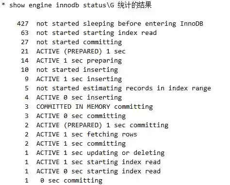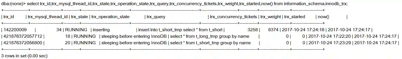 2. 通过trx_started,now()分析得出:这些query直接的切换轮询并不是真正意义上的平均公平分配,里面有一套自己的自适应算法,这里面我没有深究下去,有兴趣的同学可以继续了解源码。