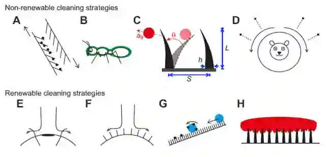 胡立德总结的8大方法分别是(A)刷;(B)分泌液体;(C)弹毛;(D)甩;(E)改变风向(睫毛);(F)改变风向(复眼毛);(G)莲叶效应;(H)蝉刺针。然而这个画风……丨论文原图
