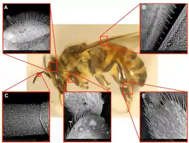 扫描电子显微镜下的蜜蜂,全是毛:(A)眼睛,(B)翅膀,(C)触角,(D)前肢,(E)后肢丨论文原图