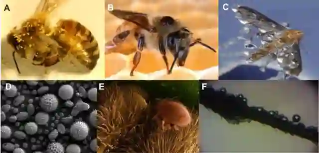 那些脏了的动物。(A)蜜蜂身上的花粉;(B)蜜蜂胸部长了一只螨虫;(C)蚊子身上沾满了水滴;(D)各种各样的花粉;(E)蜜蜂身上的螨虫;(F)沾满露珠的蚊子腿丨论文原图