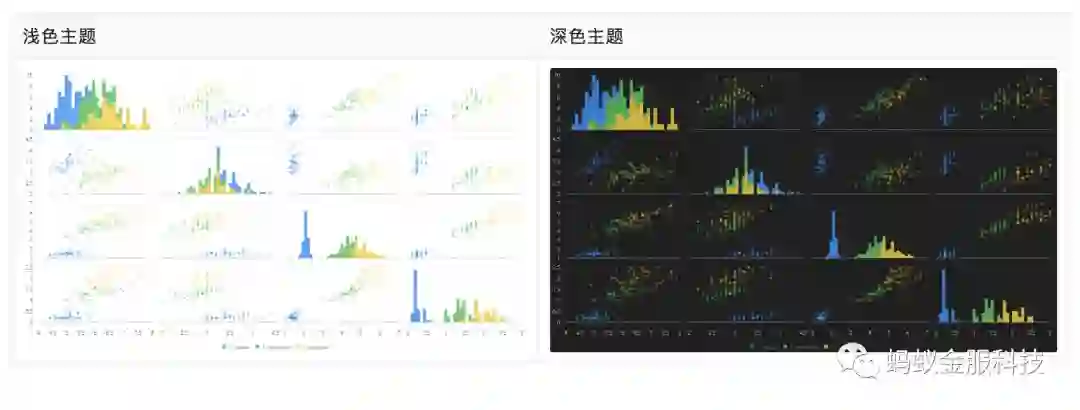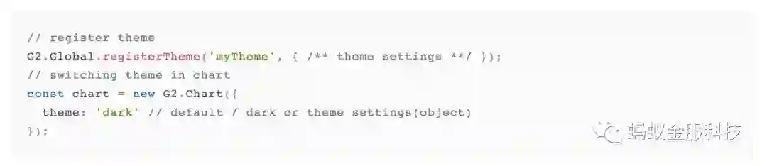 主题对 G2 而言,就是许多配置项的集合。以往修改主题必须要全局修改,牵一发动全身。3.2 在保留全局主题切换的同时,新增了自定义主题的接口,并且支持 chart 级别的主题切换。同一个应用中也能同时存在不同主题的图表了。