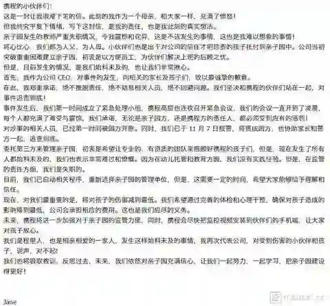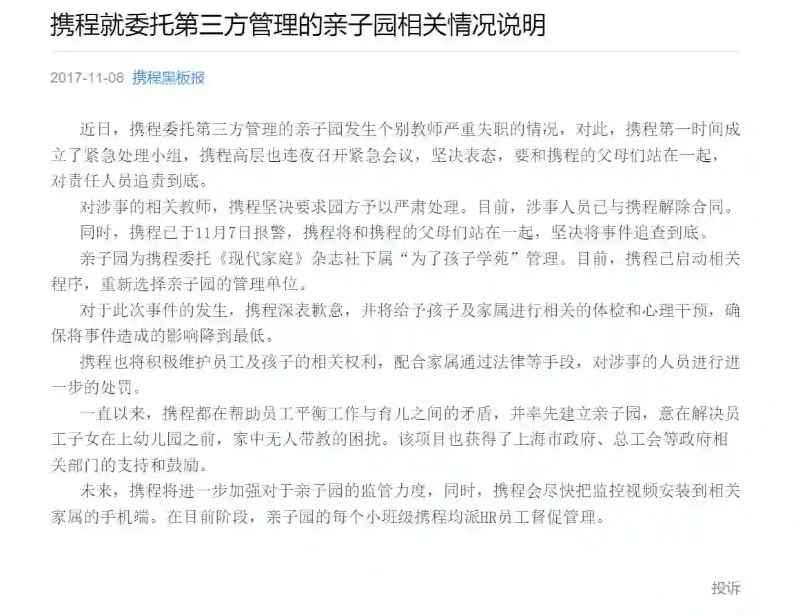 事发后,携程方表示已知晓此事,深表歉意,并于 11 月 7 日报警,同时对涉事的相关教师,携程坚决要求园方予以严肃处理。目前,涉事人员已被解雇。