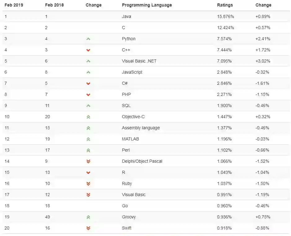 2019年2月编程语言排行榜 TOP 20 ——