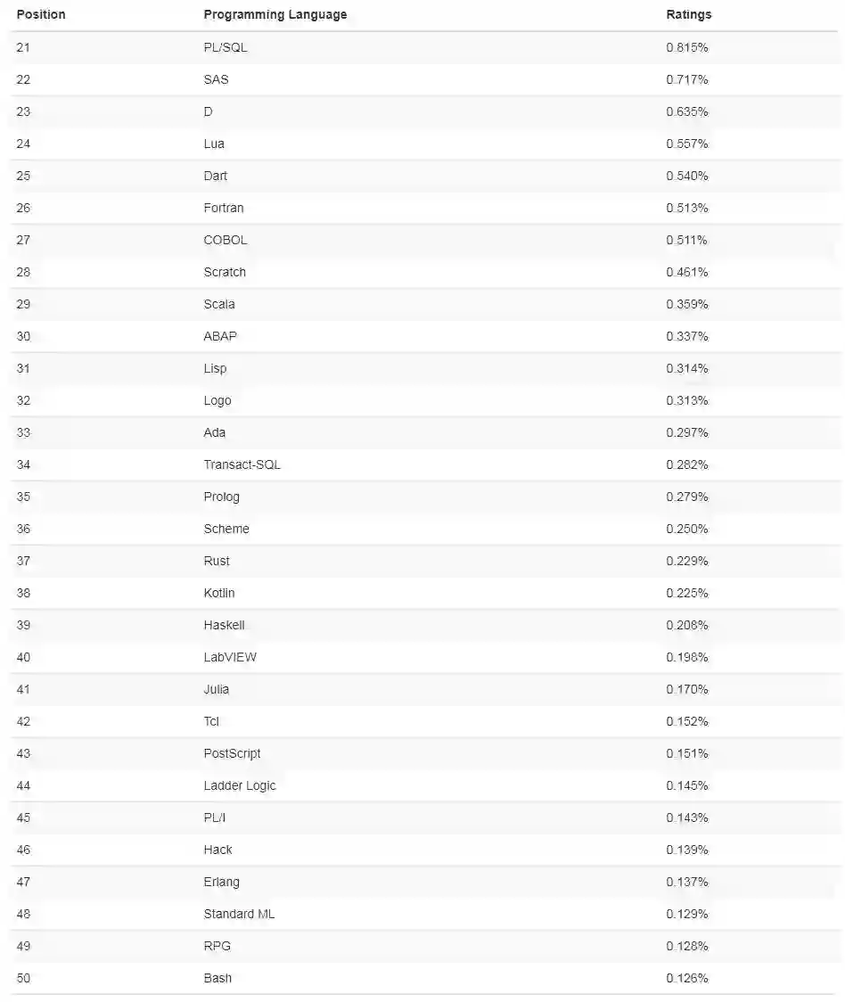 21-50 名的编程语言排行