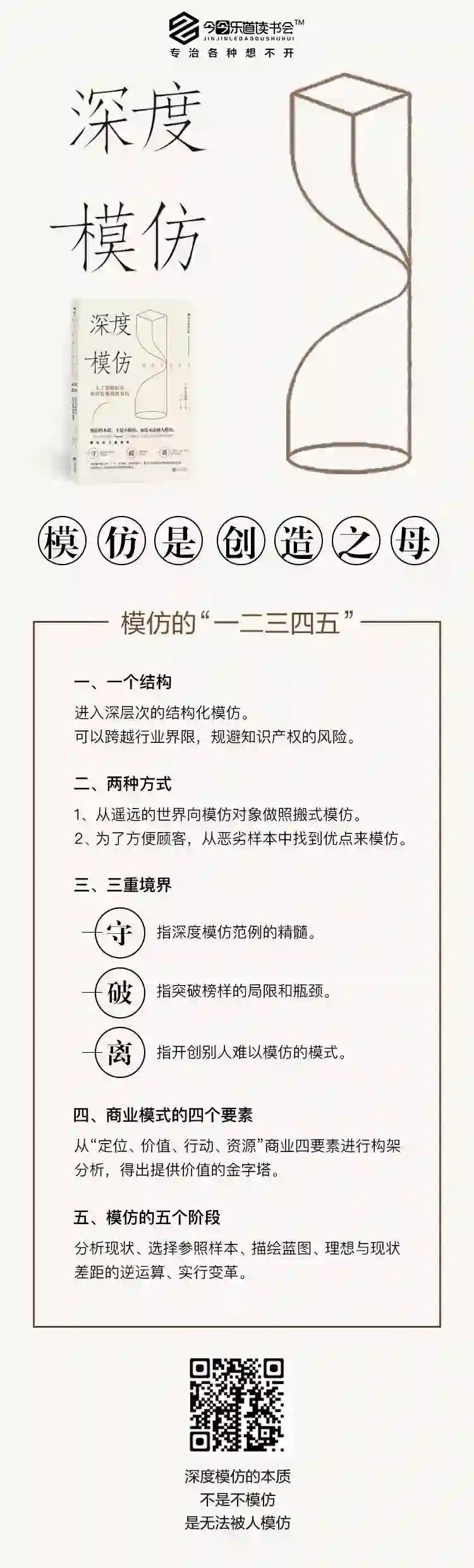 对于企业以及个人,什么样的模仿算是好的,怎样的模仿才能让自己更快成长呢?本书《深度模仿》告诉你答案,书中提出了一个很有意思的观点:模仿是创造之母。这本书是日本知名商业模式专家井上达彦的作品,作者深度剖析了日本多家优秀企业崛起时模仿借鉴其他行业、企业经验,创造自己辉煌的过程。得出了一个近乎“反直觉”的判断:模仿是需要高度智慧的理性行为,而智慧是独创性的源泉。