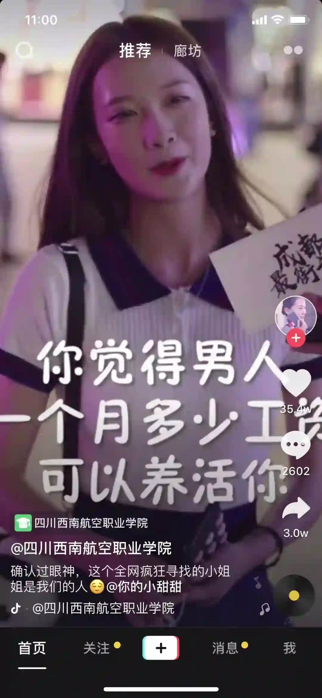一名长相甜美的成都女孩在接受“随机街访”时表示,对另一半的收入水平并没有什么具体要求,只要“能带自己吃饭就好”——这种“简单的要求”加上出众的颜值,瞬间让这名女孩成为了抖音用户们的“梦中情人”,被点燃热情的人们纷纷“通过视频”表示要去成都找到并追求这名女孩,甚至为了让她吃饭吃得开心“带上了9张信用卡”。
