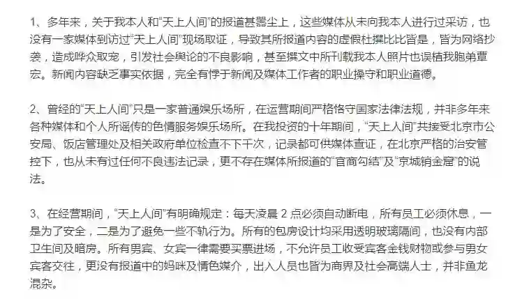 这次,覃辉显然是着急了。他不止一次撇清自己和天上人间的关系,17日的声明里说: