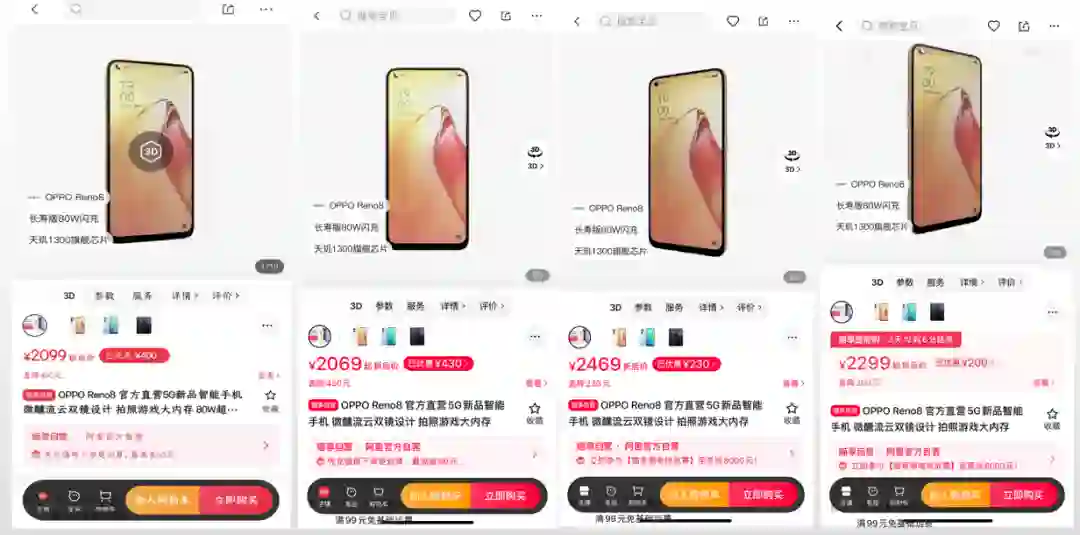一位网友打算在天猫的猫享自营上购买OPPO Reno 8,他表示,自己早早就将商品放入购物车,没想到看了一出“好戏”。10月16日的价格为2099元,10月18号的价格为2069元,降价了30元该网友还暗自庆幸,准备再等几天;结果10月19日一看价格竟然涨到了2469元,等到10月24日双十一预售开启这天,价格降到了2299元,虽然比前几天的价格要便宜一点,但比10月18日的价格仍然是贵了230块钱。