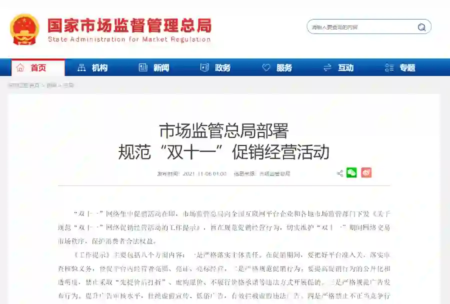 2021年,国家市场监督管理总局向全国互联网平台企业和各地市场监管部门下发了《关于规范“双十一”网络促销经营活动的工作提示》,其中专门提到严格规范促销行为。要提高促销行为的公开化和透明度,禁止采取“先提价后打折”、虚构原价、不履行价格承诺等违法方式开展促销。